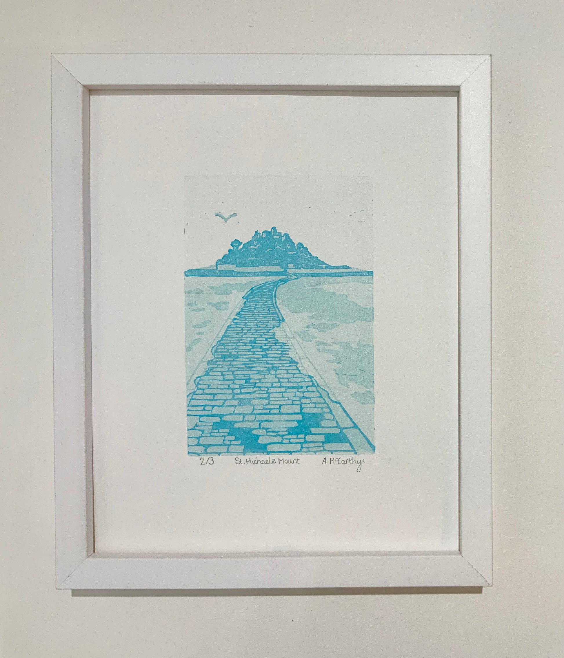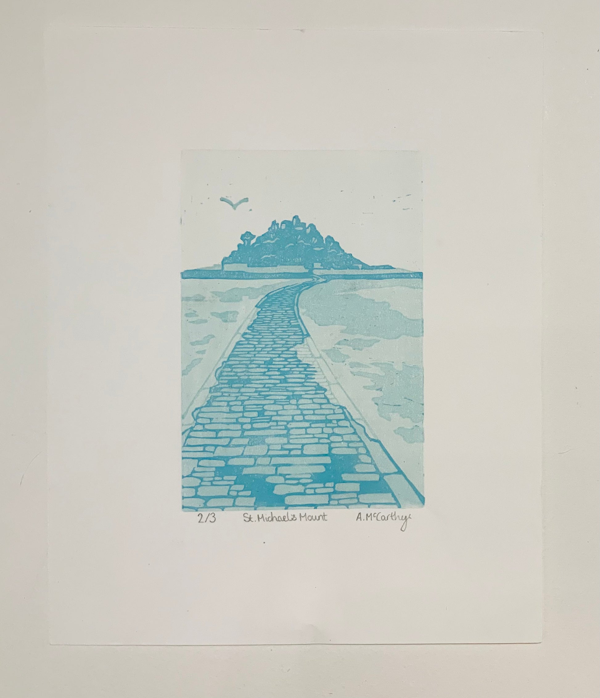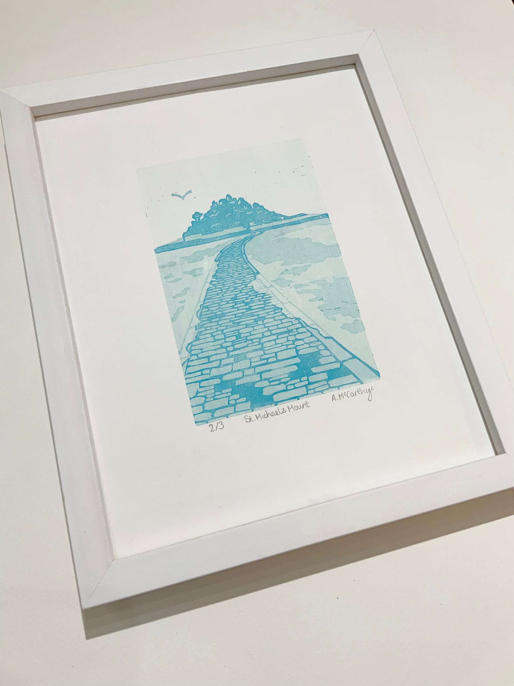 This ‘St. Michael’s Mount’ print is an original Reduction Lino Cut consisting of 4 layers. I carved it using traditional hand tools and printed it on my Pooki Press.
